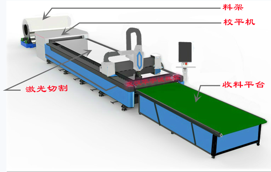 卷料全自動上下料激光切割機生產流程卷料經開卷校平后,由送料機送入激光切割機旋轉工作臺上方進行切割,隨著工作臺的移動,可實現邊送料邊切割的過程,有效縮短零件切割時間,提高了設備的使用效率,可連續性切割生產,設備利用率高。
